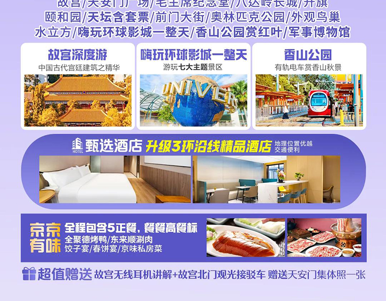 景区销售北京大多数景区都有销售旅游纪念品的商品部,游客在景区内或自由活动期间的购物行为属于个人行为,请要求商家开具发票或购物凭证以保证您的利益,此类购物与旅行社无关,如需退货旅行社只能协助处理,最终退货与否取决于相应商家,请游客慎重购买。