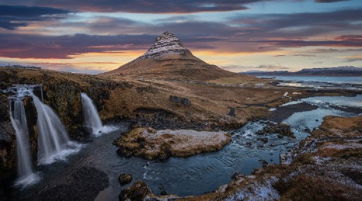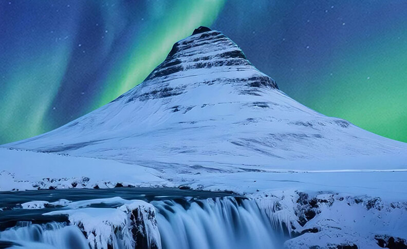 教堂山Kirkjufell(游览时间约30分钟):又名草帽山,《权力的游戏》取景地之一。圆锥型山峰,加上双层瀑布的点缀让人远远就认出它并记住它,山脚下被翠绿的草地覆盖,周围有潺潺溪流映衬,整个画面纯净至美,仲夏十分在极昼阳光照耀下更璀璨动人。