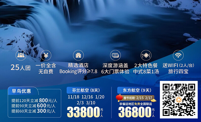 (温馨提示:由于冰岛天气多变,在冬季尤其会有各种不可预测的情形,可能需要根据天气对行程进行一定程度上的调整。蓝冰洞作为纯天然的景观,在极端天气时也许因安全问题不适宜进入。为保证安全第一,我们无法保证一定能进入蓝冰洞。烦请知晓,敬请谅解。在这种情况下,则退回人民币1000元/人,恕不另行通知,敬请谅解。)