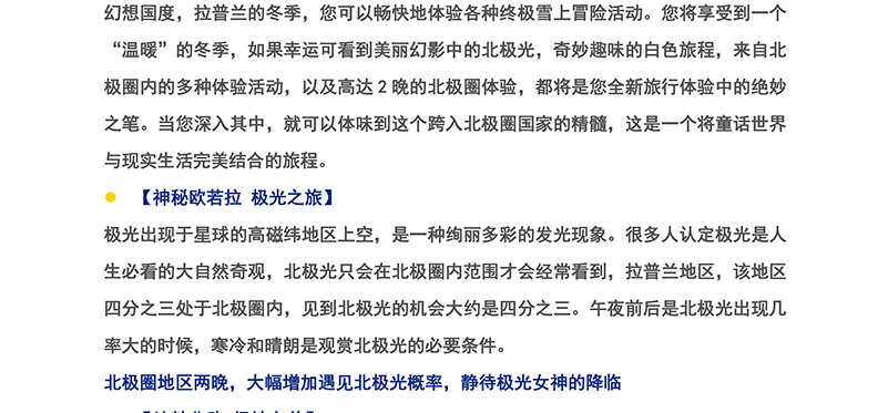 3. 极光观赏取决于当时当下的天气情况和清晰的能见度,若因恶劣天气等不可抗力客观因素,则行程安排将做相应调整,敬请谅解。