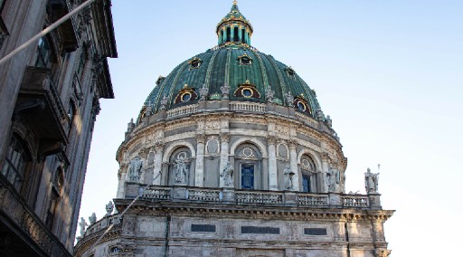 【阿美琳堡王宫广场】丹麦最壮观的洛可可式建筑之一,也是目前丹麦王室居住的地方。每天都有皇家卫兵的换岗仪式。皇家卫兵会在每天上午 11 点半时从宫殿出发绕行旧市区后回到八角广场,12 点时准时进行换岗仪式。皇家卫兵头戴毛茸茸的黑色高帽,身穿笔挺的黑色上衣与蓝色长裤,胸前交叉有耀眼的白色十字带。远处望去,从容威武,庄严肃穆。【腓特列教堂】外观,又叫大理石教堂。是北欧国家最经典的文艺复兴宫殿之一。气势恢宏又华丽异常,这里还是哥本哈根很多新人举行婚礼的理想场所。