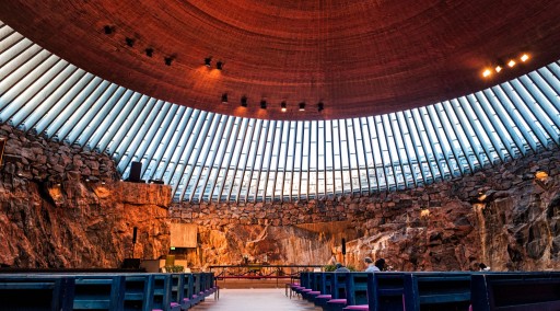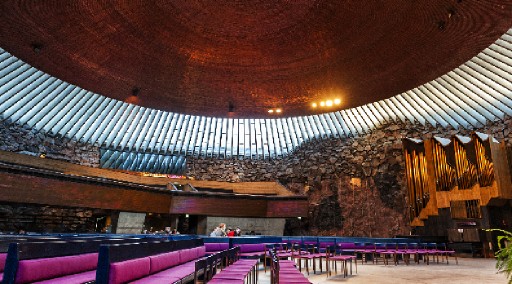 前往赫尔辛基旧城区参观全部以岩石建造的别具一格的【岩石教堂】(入内参观约 40 分钟,含门票),感受石光之美。与大部分人印象中欧洲华丽壮观的教堂相比,岩石教堂更多的是自然和人文的融合。整个教堂从巨大的岩石从上往下挖掘,挖出的碎石就用于教堂的墙面和屋顶的搭建。教堂内部直接被开凿在坚硬的岩石之中,自然光从圆形穹顶的周围倾泻而下,洒满整个室内。建筑优越的声响效果,教堂常被当作音乐厅来使用,这种传声质量来源于教堂未经打磨的原声岩石内壁。这种创新的建筑,不仅减少了对环境的影响,还赋予了教堂独特的外观,具有粗糙的墙壁和独特的穹顶结构,拱顶隐隐约约反射着下面的烛光,使整个教堂充满艺术感染力,该教堂是芬兰创造力和建筑与自然和谐共存的典范。