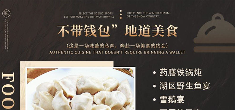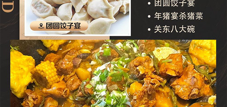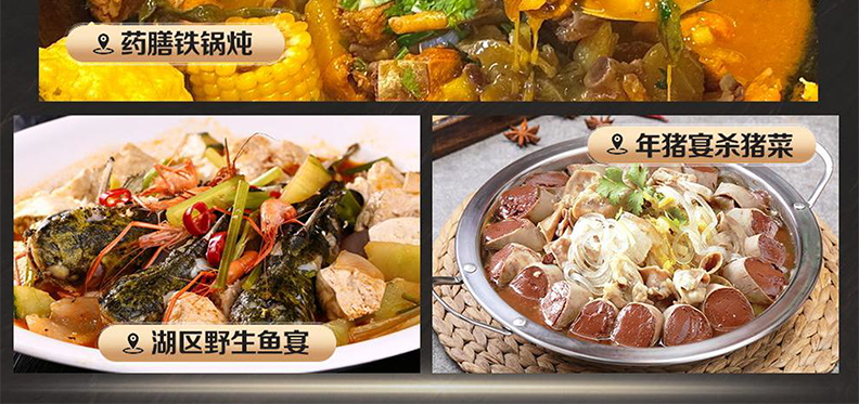 药膳铁锅炖、湖区野生鱼宴、雪鹅宴、团圆饺子宴、年猪宴杀猪菜、关东八大碗