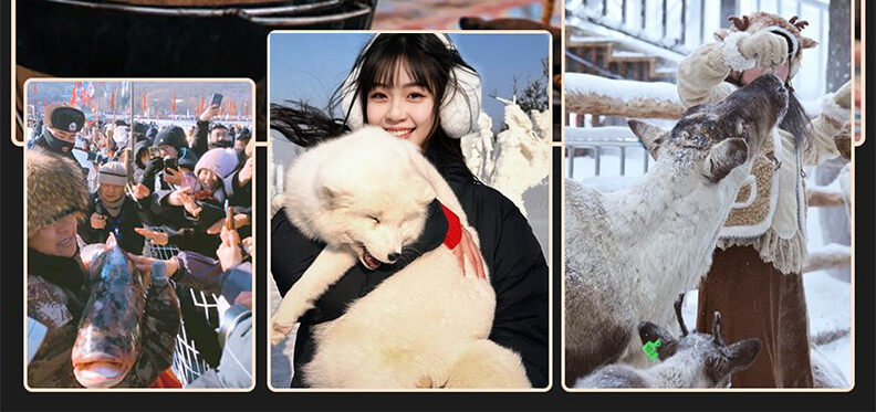 【冰瀑雪寂,围炉煮雪】—— 天地为席,赴一场冰雪茶宴 我们在冰瀑前辟出一方暖域,生起铸铁炭炉,燃起相思木炭,任外界-20℃寒霜凛冽,炉上铁壶却蒸腾着滚滚白烟,茶香破开冷空气,织就温暖结界,三五好友围坐,此刻身心俱憩观赫哲族冰上冬捕,在湖边品尝一碗又暖又鲜熬的白白的鱼汤这是来自大自然的馈赠亲喂精灵驯鹿,亲抱雪狐狸,快来打卡拍照——咔嚓!这是一次与童话居民的亲切会晤