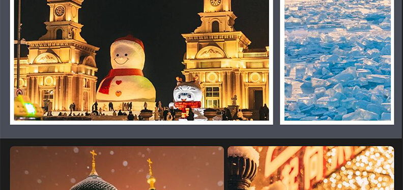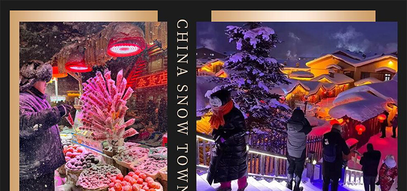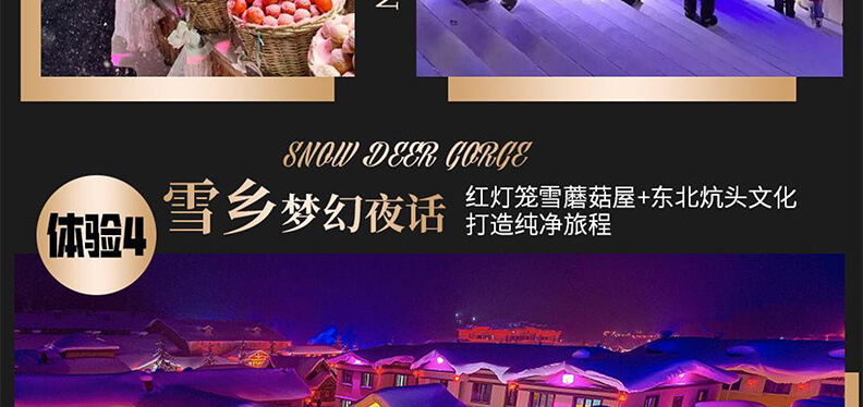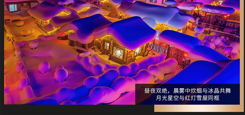【梦幻家园】(夜景+二人转表演)(园中园景区及夜间表演费用自理348/人)一个个憨态的雪蘑菇、呆呆的雪屋在夜空和大红灯笼的照耀下放射着紫盈盈的光芒,像一朵朵快要融化的奶油,想不想尝尝他是不是甜甜的? 摄影大咖的获奖作品多来自此地哦,赶快来拍下你自己的获奖作品吧!拍完属于自己的大片,感兴趣的朋友一定要去看一下东北二人转,零下20°C的天气,享受100°C的快乐,体验东北人“宁舍一顿饭、不舍二人转”的民俗文化。