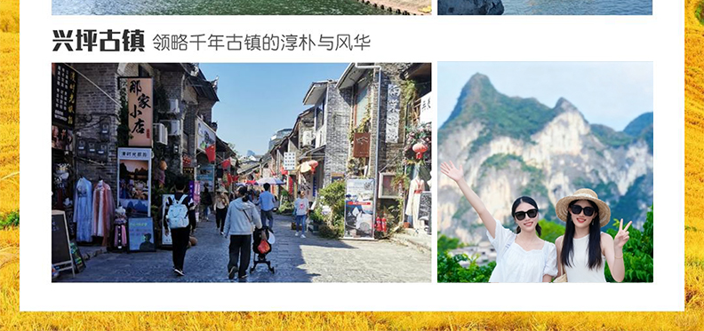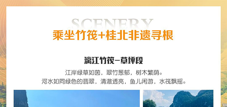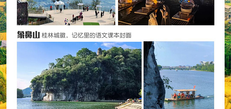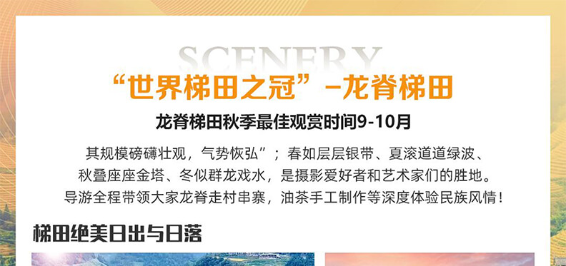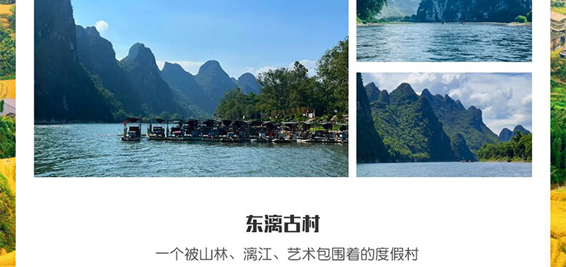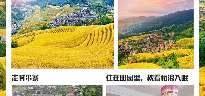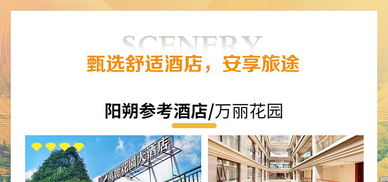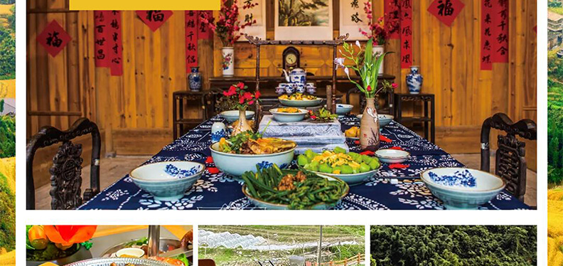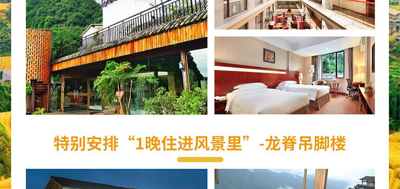 3、门票:行程所列景点首道大门票(不含景区小交通)。4、用餐:3早4正+1米粉,酒店含早,不占床不含早双人标间,4正餐+1米粉,桂林米粉10元/人,正餐餐标35元/人,欢迎宴50元/人,大户人家宴40元/人,正餐10人一桌,人数不足10人菜相应调整、特色餐:龙脊米酒竹筒土鸡宴、啤酒鱼、篝火晚会长桌宴、大户人家宴