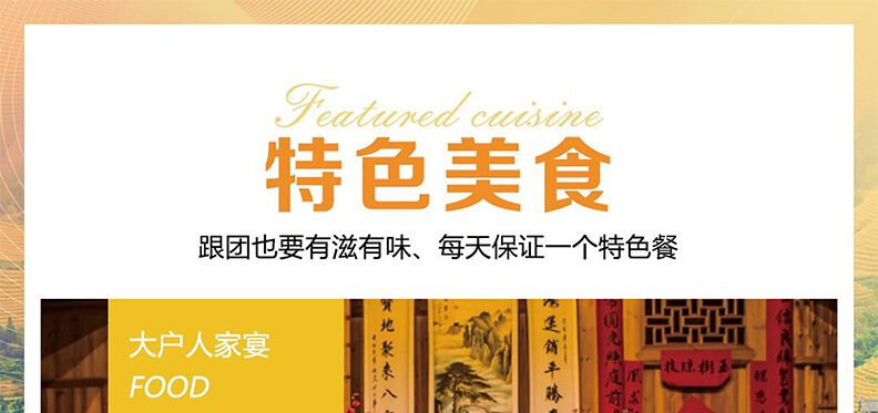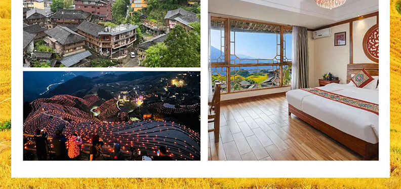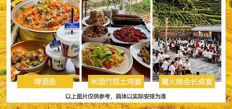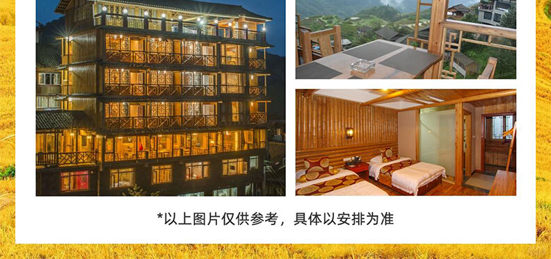 4、用餐:2早4正,酒店含早,不占床不含早双人标间2正餐,正餐标35元/人,欢迎宴50元/人,大户人家宴40元/人,正餐10人一桌,人数不足10人菜相应调整,特色餐:龙脊米酒竹筒土鸡宴、啤酒鱼、篝火晚会长桌宴、大户人家宴