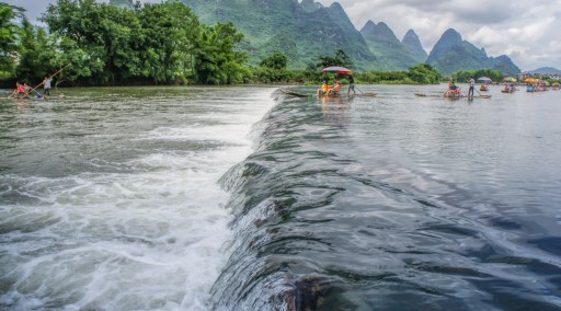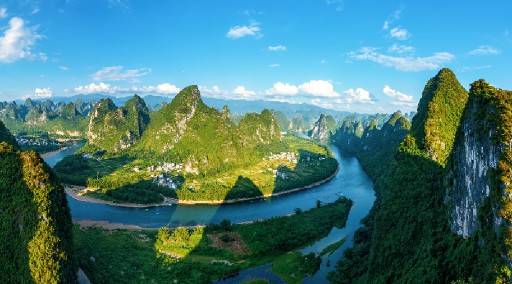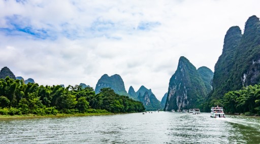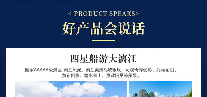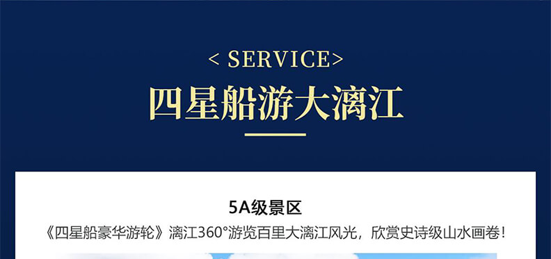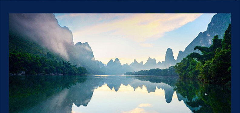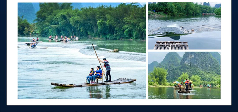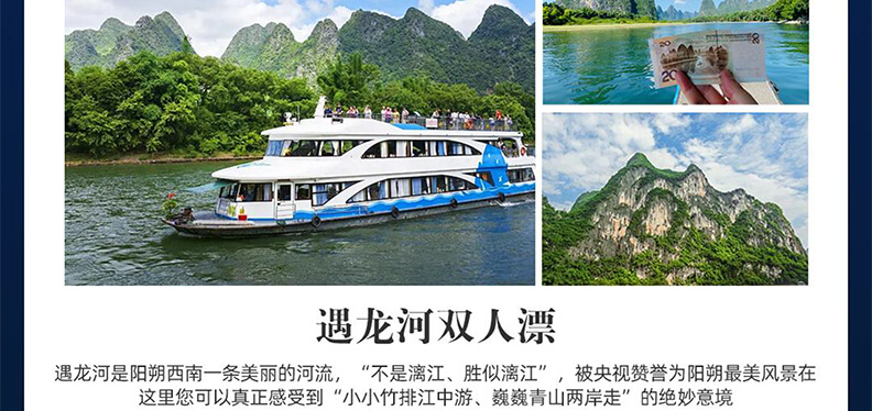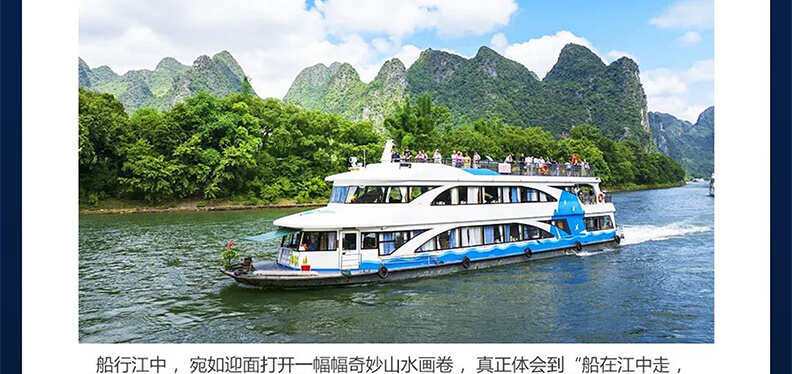 顺江而下 ,您可欣赏桂林至阳朔整段漓江水域全程美景 ,尽情欣赏杨堤飞瀑、浪石烟雨、九马画山、黄布 倒影、兴坪佳境(20 元人民币背景图)等五大漓江美景高潮 ,只有看完这 5 大美景 ,才算到过大漓江。船 行江中 ,宛如迎面打开一幅幅奇妙山水画卷 ,真正体会到“船在江中走 ,人在画中游”的绝美漓江仙境 , 观奇峰倒影、碧水青山、牧童悠歌、渔翁闲钓、古朴的田园人家、清新的呼吸 ,一切都那么诗情画意。