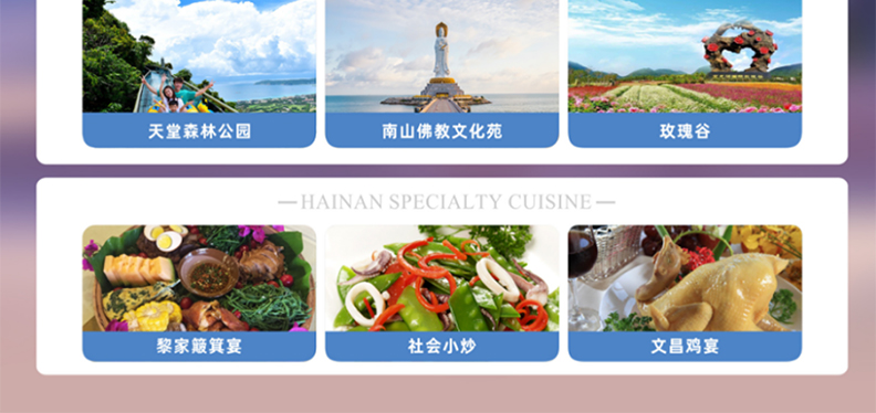 8、特别提示:部分景区由于交通工具的特殊性,故对旅游者的年龄和身体条件有相应的要求,如岛屿类(蜈支洲岛、分界洲岛、西岛等)景区规定60岁以上及行动不便游客(包括孕妇)需填写景区的免责声明方可登船上岛,70周岁以上老年人出于安全考虑,景区原则上不予接待(我社按团队采购成本价格予以退费),敬请知晓。