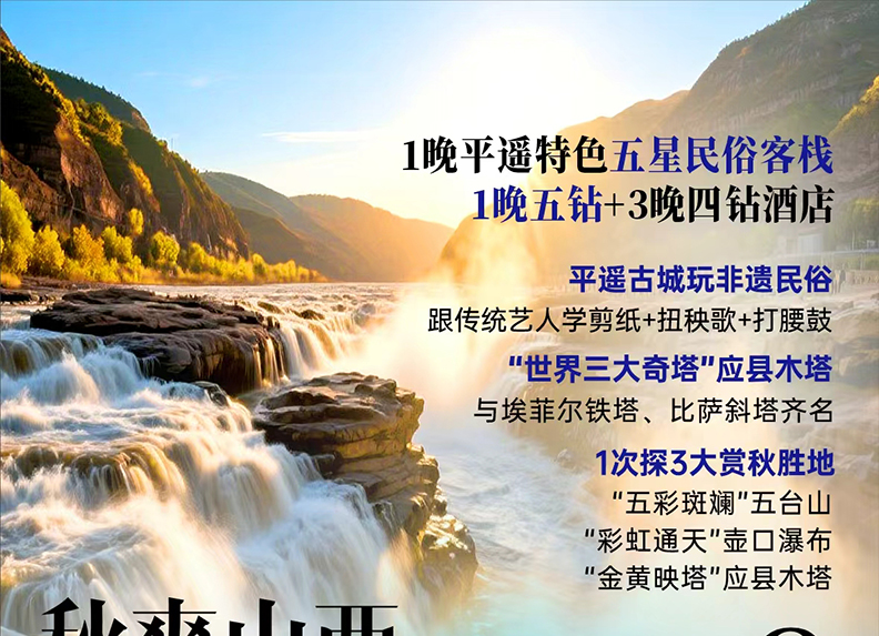 酒店住宿:行程所列1晚平遥五星特色客栈+3晚四钻酒店+1晚五钻酒店(以两人一房为标准),报价含每人每天一张床位,单人需补单房差;