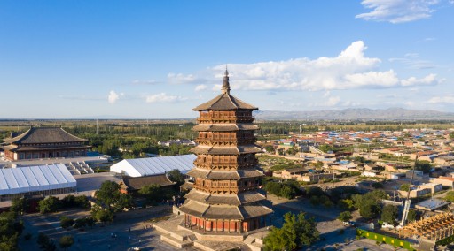 【应县木塔】(参观约 1 小时)又名佛宫寺,释迦塔,建于公元 1056 年(辽清宁二年,即北宋至和三年),塔高67.31 米,底层直径 30.27 米,总重量约为 7400 多吨,是世界上现存最高大、最古老纯木结构楼阁式建筑。与法国埃菲尔铁塔、意大利比萨斜塔并称“世界三大奇塔”。