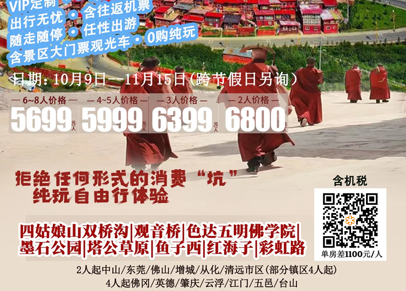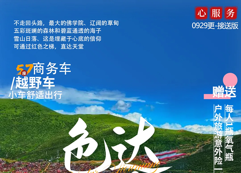 早餐过后告别晨曦,前往金川途经金川大峡/或八美途经雅拉雪山,观雅拉雪山神貌;途经炉霍前往翁达,历史上这里是茶马古道的途经之地,也许是因为气候的原因,曾有人将这里称为高原牧区的小江南。最终抵达色达县,(客人自行自由活动,因为门票需要实名预约)色达五明佛学院当地也叫喇荣沟,顺沟上行数里,蔚蓝苍穹之下,银岭碧草之间,数千间赫红色的木屋,如众星拱月般簇拥着几座金碧辉煌的大殿--它就是藏于深山中的喇荣寺五明佛学院,也称色达佛学院。色达佛学院是世界上很大的藏传佛学院。常住的喇嘛有两万多人。每遇有佛事活动人数还会增加,最多时可达四万多人。这里的僧舍很壯观,如果你是初次到色达,其庞大的阵势往往会让你目瞪口呆;在佛学院最高的山峰上,有一个金碧辉煌的建筑,叫做“坛城”(音译)。它的上半部分是转经的地方,下面一层是转经筒,金色的圆筒在人们干枯的手转过之后留下一串悠长的嘎吱嘎吱的响声。