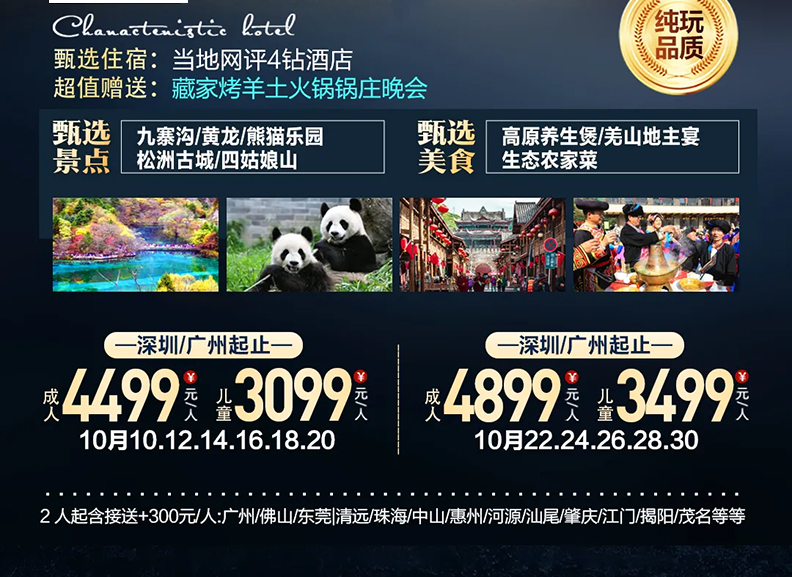 【用餐】:5早4正餐;行程指定特色用餐,九寨晚餐酒店配送;
