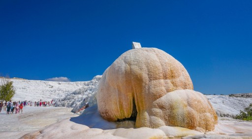 【棉花堡】:这里有世界上独一无二奇妙景观。棉花堡的地下温泉水不断从地底涌出,含有丰富矿物质如石灰等,经过长年累月,石灰质聚结形成棉花状之岩石,层层叠叠,构成自然壮观的岩石群和水池。