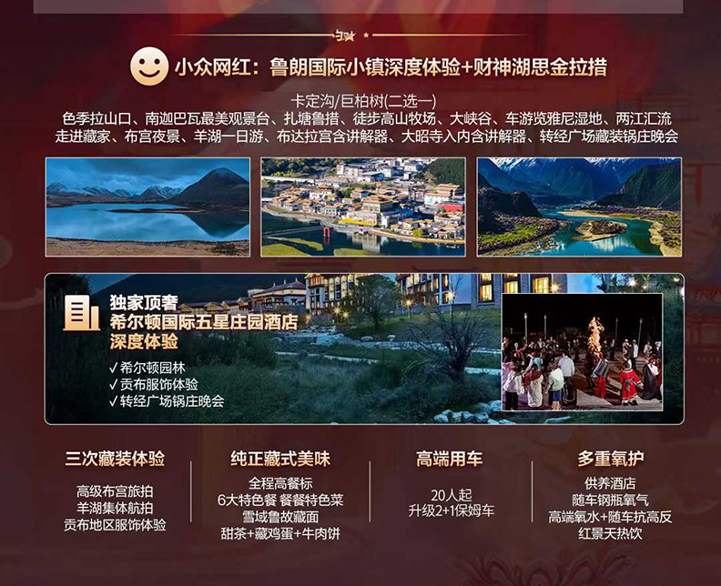 2)赠送6个特色餐:1.雪域鲁固藏之味、2.鲁朗石锅鸡、3.石锅鱼、4.大峡谷自助餐、5.藏式烤羊晚宴、6.牦牛汤锅。每天一瓶氧之泉、市内晚餐自理!