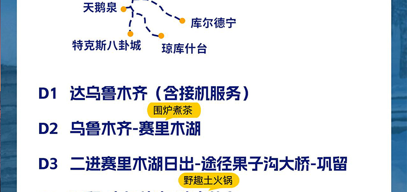 早餐后乘车前往【库尔德宁】(游玩时间约4H)冬天的库尔德宁像一首被雪藏起来的静谧童话。这里是中国最大的雪岭云杉原生地,冬日里,万千云杉披覆着厚厚积雪,如同无数披着白色斗篷的巨人,静默地伫立在绵延的山峦之间。雪是绝对的主宰,它温柔地抹平了草原的所有轮廓,将河谷、草甸、森林都纳入一片无瑕的纯白绒毯之下。空气清冷彻骨,却异常通透,唯有炊烟般的寒雾在林间慢悠悠地飘荡。冰封的巩乃斯河化作一条蜿蜒的玉带,偶尔在冰面下传来细微的潺潺水声,是这片沉睡世界里唯一的心跳。时间在这里仿佛被冻结,只剩下脚步踩碎积雪的“嘎吱”声,以及被惊起的寒鸦振翅时,抖落枝头一簌簌晶莹的雪沫。后前往【琼库什台】(游玩时间约2H),当日头西沉,最后一抹金色的阳光如同温柔的画笔,轻轻掠过琼库什台连绵的雪原,为纯白的世界镀上了一圈琥珀色的光晕。巍峨的雪山仿佛被点燃,呈现出短暂的、瑰丽的“日照金山”奇观。木屋的炊烟袅袅升起,笔直地融入清冷的空气中,整个世界慢了下来,静得能听见雪落松枝的簌簌声。赠送【野趣土火锅】 这不仅仅是晚餐,更是寒冷中最隆重的款待。铜锅里,汤汁咕嘟咕嘟地翻滚,浓郁的香气瞬间驱散了周身最后一丝寒意。