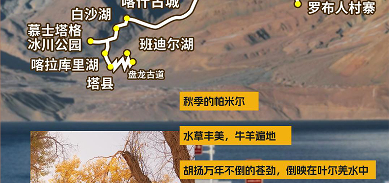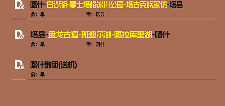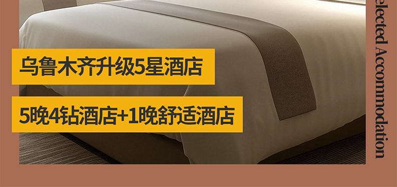精选住宿:全程7晚住宿(1晚乌鲁木齐5星+5晚4钻酒店+1晚塔县3钻酒店);
