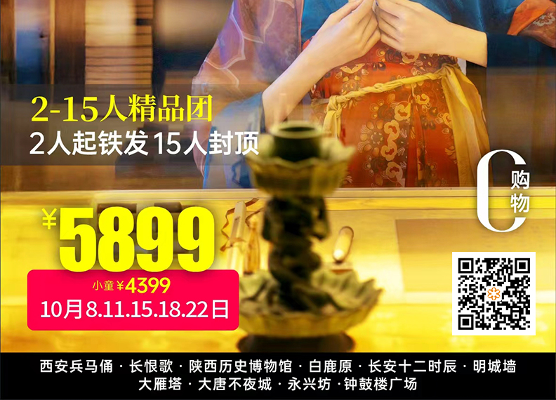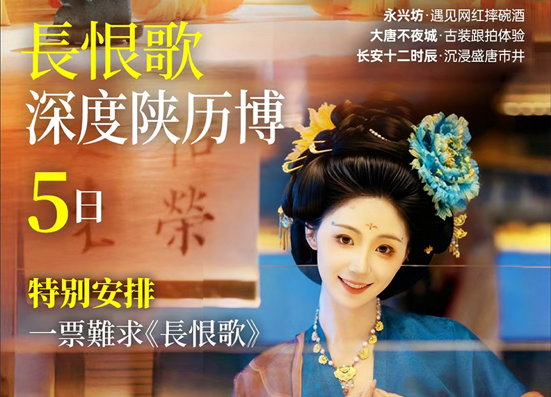 深度陕历博长恨歌 西安双飞 5 日 0 购物 / 西安兵马俑 / 陕西历史博物馆 / 长恨歌 / 白鹿原 / 长安十二时辰 / 明城墙 / 大雁塔 / 大唐不夜城 / 永兴坊 / 钟鼓楼广场