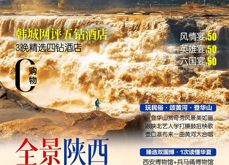 【黄河壶口瀑布】(不含壶口电瓶车40元/人)“黄河之水天上来,玉关九转一壶收”,壶口瀑布仅次于贵州省黄果树瀑布是我国第二大瀑布。万里黄河至此,河床由300多米宽突然收缩到50多米,浩淼的黄河水骤然收成一束,从30多米落差的黄河壶口飞流直下,气势磅礴,奇特壮观;