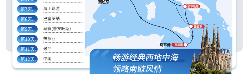 岸上观光:前往西班牙现代派著名建筑大师安东尼奥高迪的著名作品【奎尔公园】,它是富商桂尔先生出资请高迪设计建造的,公园所有建筑造型大胆奇异色彩丰富构思巧妙,可以说是惊世之作。之后我们将外观可谓是大师安东尼奥•高迪作品中最最举世瞩目的【圣家族大教堂】,它是世界上最富神奇色彩的建筑之一,也是巴塞罗那最宏伟的建筑和最著名的旅游胜地,它至今已动工一百年但迄今仍未完成的神圣建筑。接着前往令世界各地游客流连忘返的【哥特区】,哥特区是西班牙中世纪风格老城区,是巴塞罗那古典与现代完美结合的典范。而在哥特区的中心(外观)著名的【大教堂】,加泰罗尼亚哥特式风格的建筑气势震撼。外观高迪的【米拉之家】,【游览格兰大道】,从兰布拉一直延伸到加泰罗尼亚广场,既有大型百货公司还有许多精品店,客人可在那里自由活动,在世界顶级品牌店里铺采购喜爱的名品。