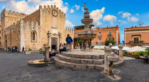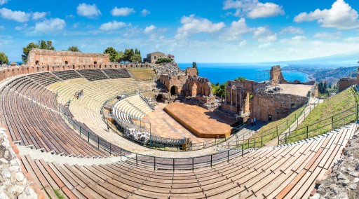 岸上观光:在领队的带领下下船,乘坐巴士前往距离墨西拿约 50 公里的【陶尔米娜】(Taormina),这里有修建于公元前三世纪的【古希腊剧场*】,并被古罗马人重修过,我们将入内参观,从这里还可以远眺欧洲最大的活火山——埃特纳火山。客人可有时间在这个风景美丽又可爱的小镇上自由活动。参观【墨西拿教堂】及【广场喷泉】等。之后返回邮轮码头。