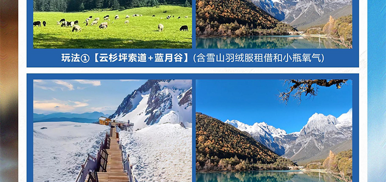 A 线(云杉坪索道):乘车前往丽江,【云杉坪索道】(含雪山羽绒服租借和小瓶氧气)探秘玉龙第三国,欣赏更富有层次感的玉龙雪山,漫步于高山草甸和原始森林中,全身心融入纯净的大自然,随后游【蓝月谷】(含蓝月谷电瓶车)