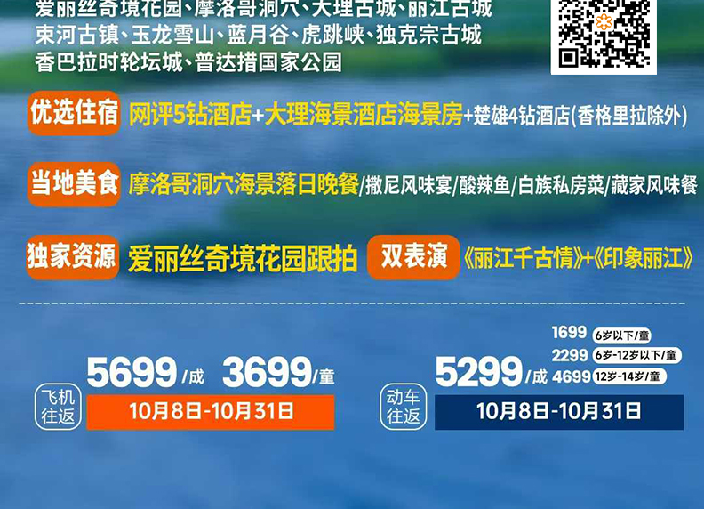 1、交通:往返程动车票二等座//飞机经济舱特惠机票。进出港口、航班时间等以航司出票为准。参考航班起飞时间(06:00-23:55)如有特殊要求,请报名前咨询前台工作人员并书面说明,如无特殊要求,我社按当天团队特惠机位安排,如无法安排,不另通知,以航空公司安排航班时间为准,不可更改。