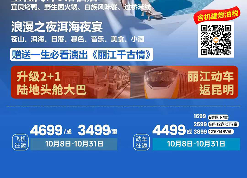 1、交通:往返程动车票二等座//飞机经济舱特惠机票及税。进出港口、航班时间等以航司出票为准。参考航班起飞时间(06:00-23:55)如有特殊要求,请报名前咨询前台工作人员并书面说明,如无特殊要求,我社按当天团队特惠机位安排,如无法安排,不另通知,以航空公司安排航班时间为准,不可更改。
