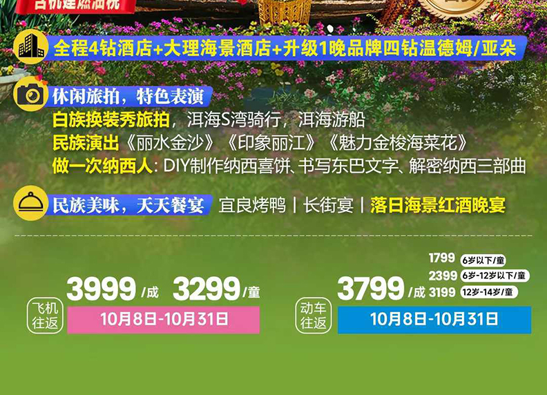 13岁-14岁以下价格含往返动车儿童票+导服+旅游车位+正餐;含床位和早餐,含门票。