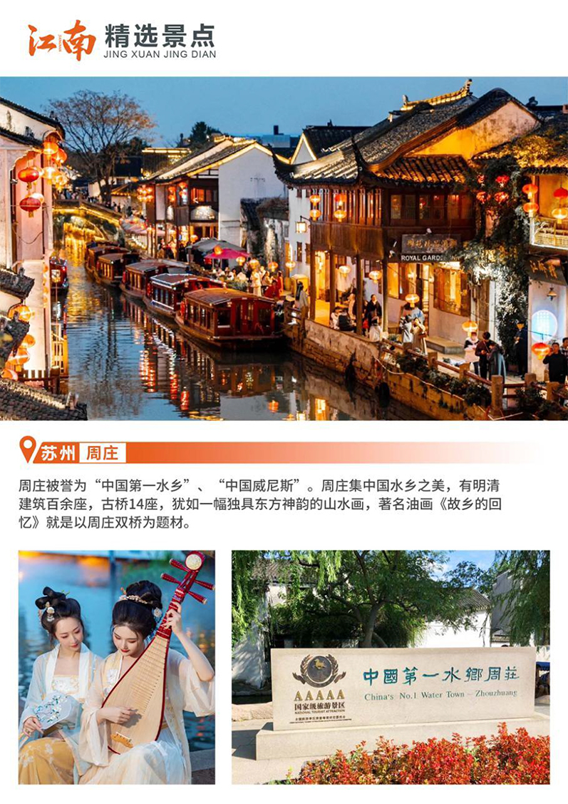 【苏州:周庄】5A,游览:3小时。周庄被誉为“中国第一水乡”、“中国威尼斯”。周庄集中国水乡之美,有明清建筑百余座,古桥14座,犹如一幅独具东方神韵的山水画,著名油画《故乡的回忆》就是以周庄双桥为题材。周庄主要景点还有:沈万三故居、张厅、富安桥、双桥、怪楼、周庄八景等。周庄名菜是“万三蹄”,因避讳朱元璋的姓氏,不叫猪蹄,这个典故与周庄首富沈万三有关。